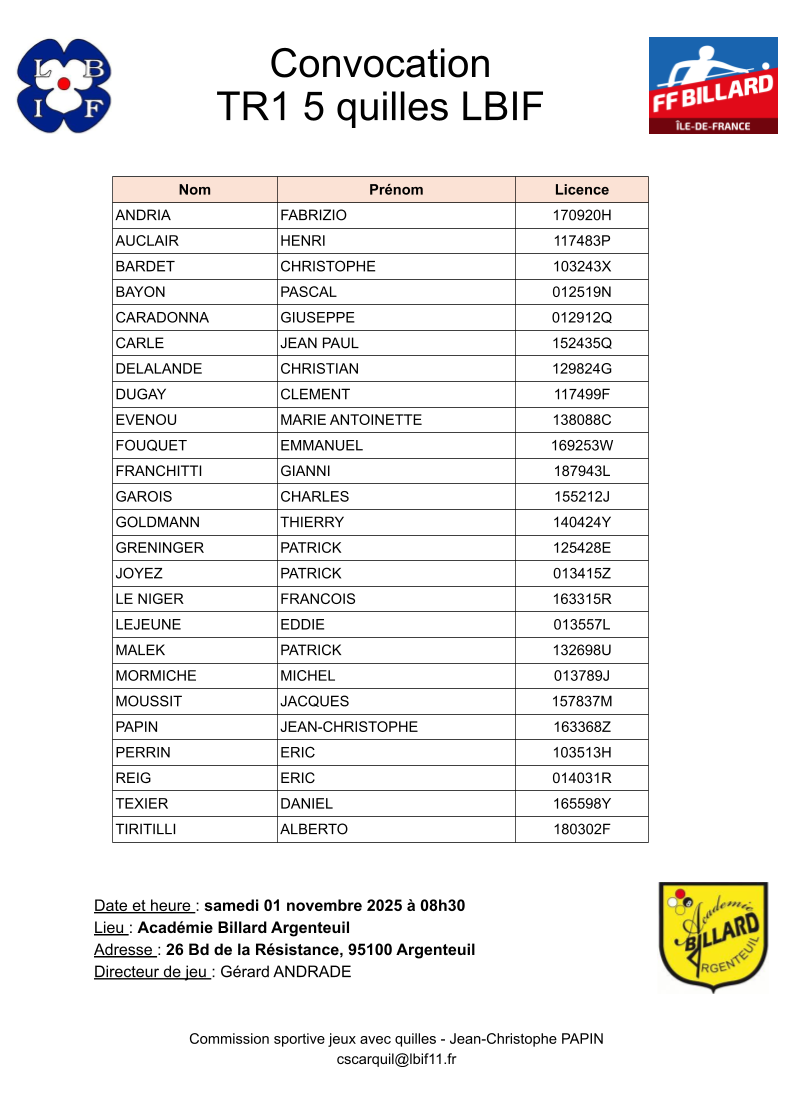 Voici la liste des joueurs inscrits pour le premier tournoi 5 quilles LBIF